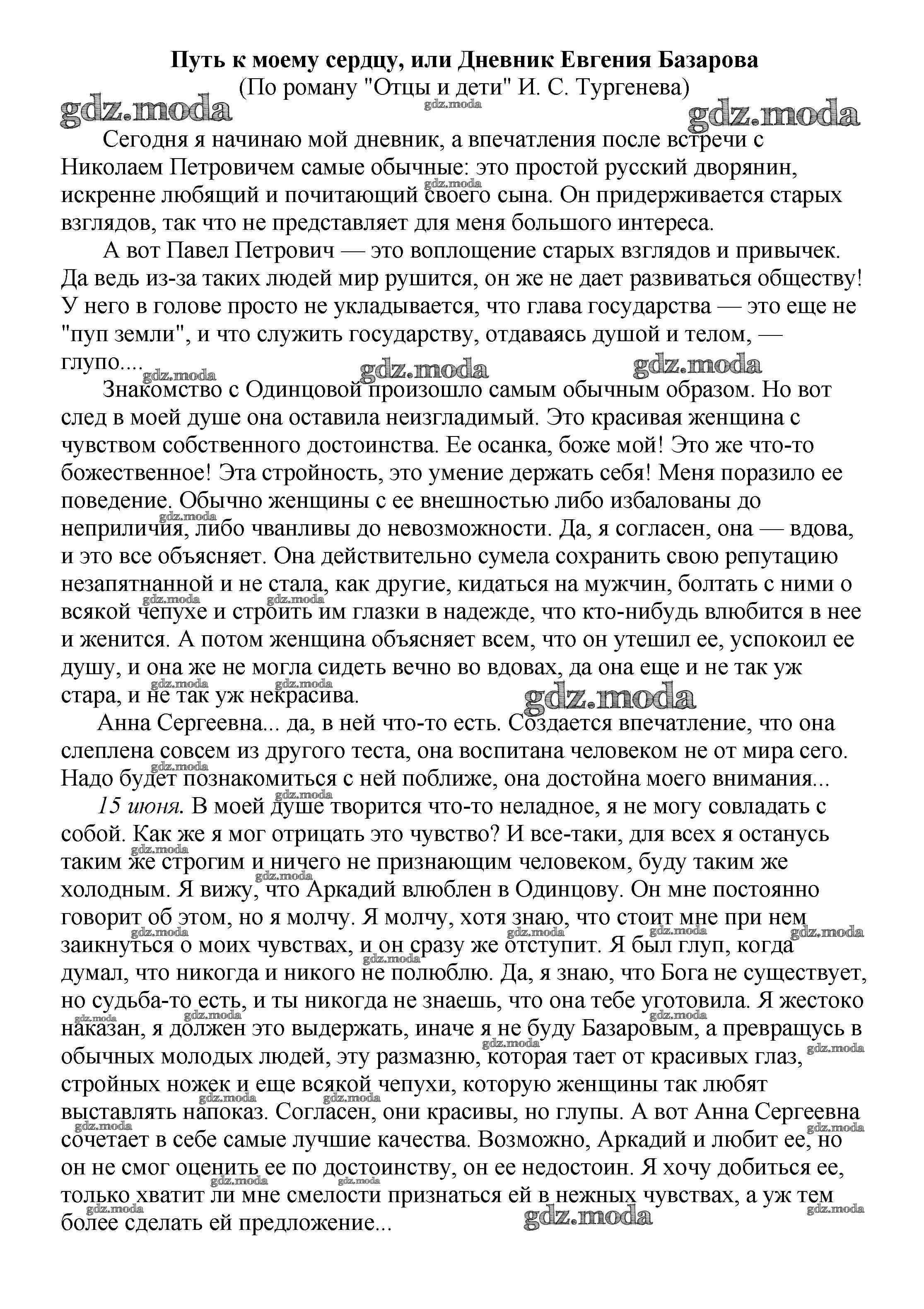 ГДЗ решение к заданию № Путь к моему сердцу, или Дневник Евгения Базарова (По роману "Отцы и дети" И. С. Тургенева) Сочинения по русской литературе, зарубежной литературе 5-10 классы Белик Э. В. Баро-Пресс 2017 бесплатно на гдз.мода!