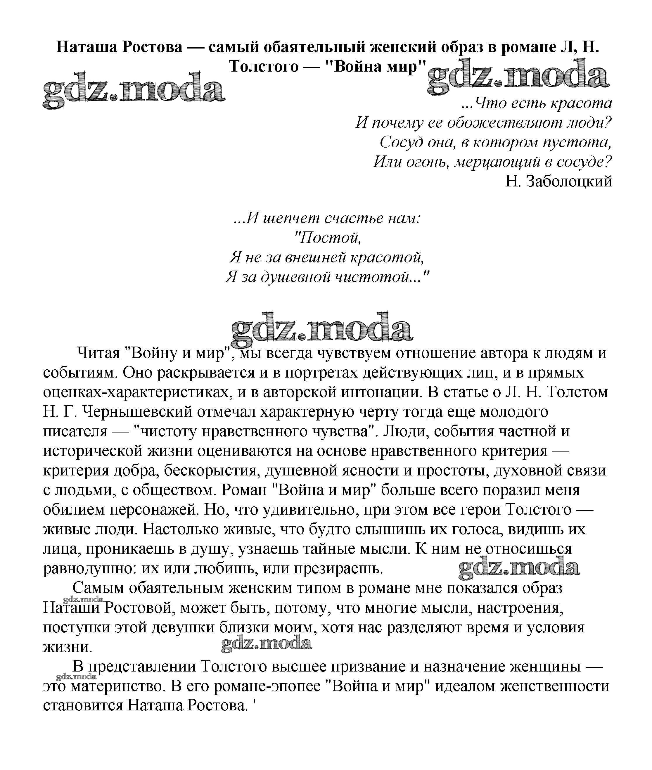 ГДЗ решение к заданию № Наташа Ростова — самый обаятельный женский образ в романе Л, Н. Толстого — "Война мир" Сочинения по русской литературе, зарубежной литературе 5-10 классы Белик Э. В. Баро-Пресс 2017 бесплатно на гдз.мода!