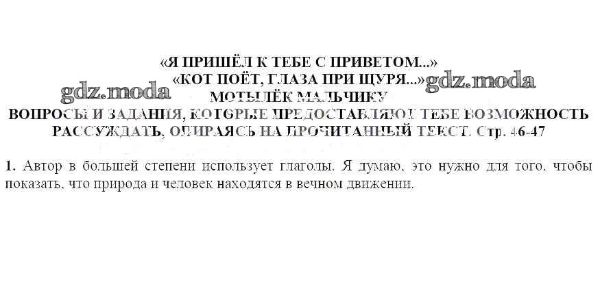 часть 2 / Я пришёл к тебе с приветом... Кот поёт, глаза при щуря. Мотылёк мальчику / Вопросы и задания, которые дают тебе возможность рассуждать, опираясь на прочитанный текст (стр. 46-47) / 1