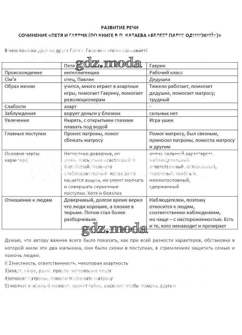 ОТВЕТ на задание № Развитие речи. Сочинение Петя и Гаврик (по книге В.П. Катаева Белеет парус одинокий) Рабочая тетрадь по Литературе 5 класс Бунеев Школа 2100