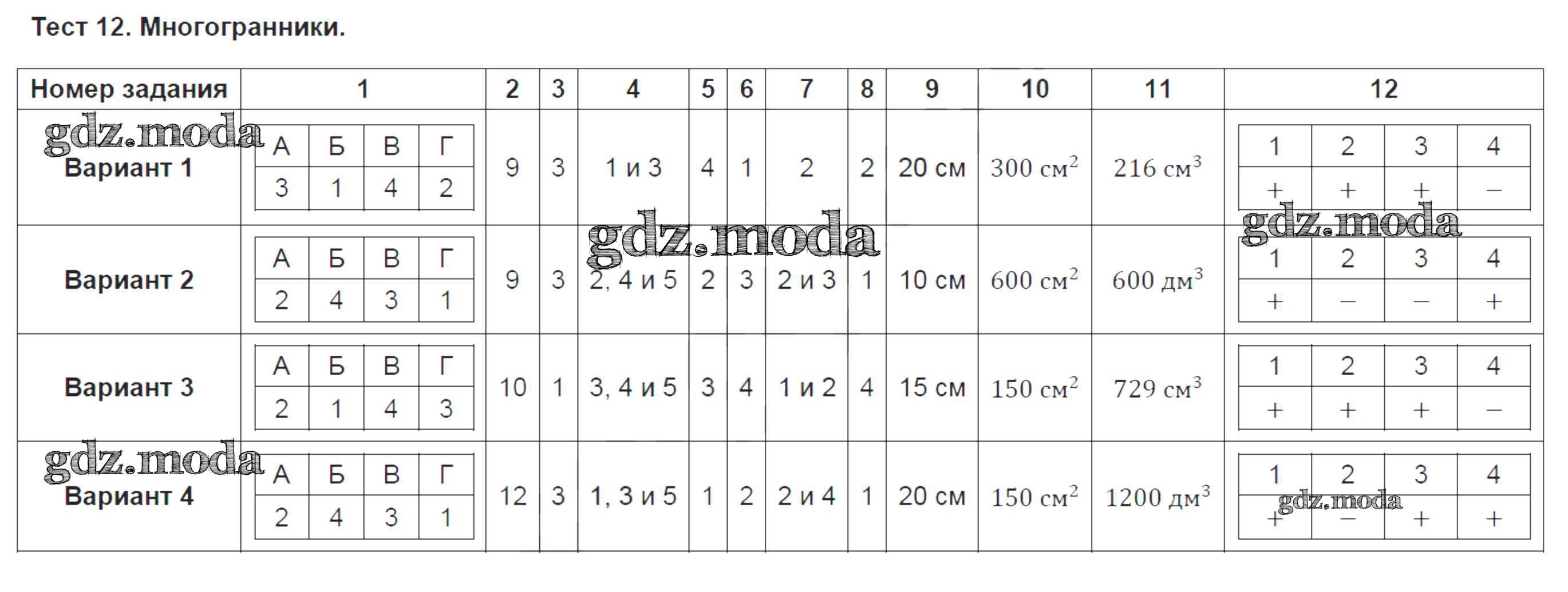 ГДЗ решение к заданию № Тест №12. Многогранники Математика 5 класс Тематические тесты Кузнецова Л.В. Просвещение 2018 ФГОС бесплатно на гдз.мода!