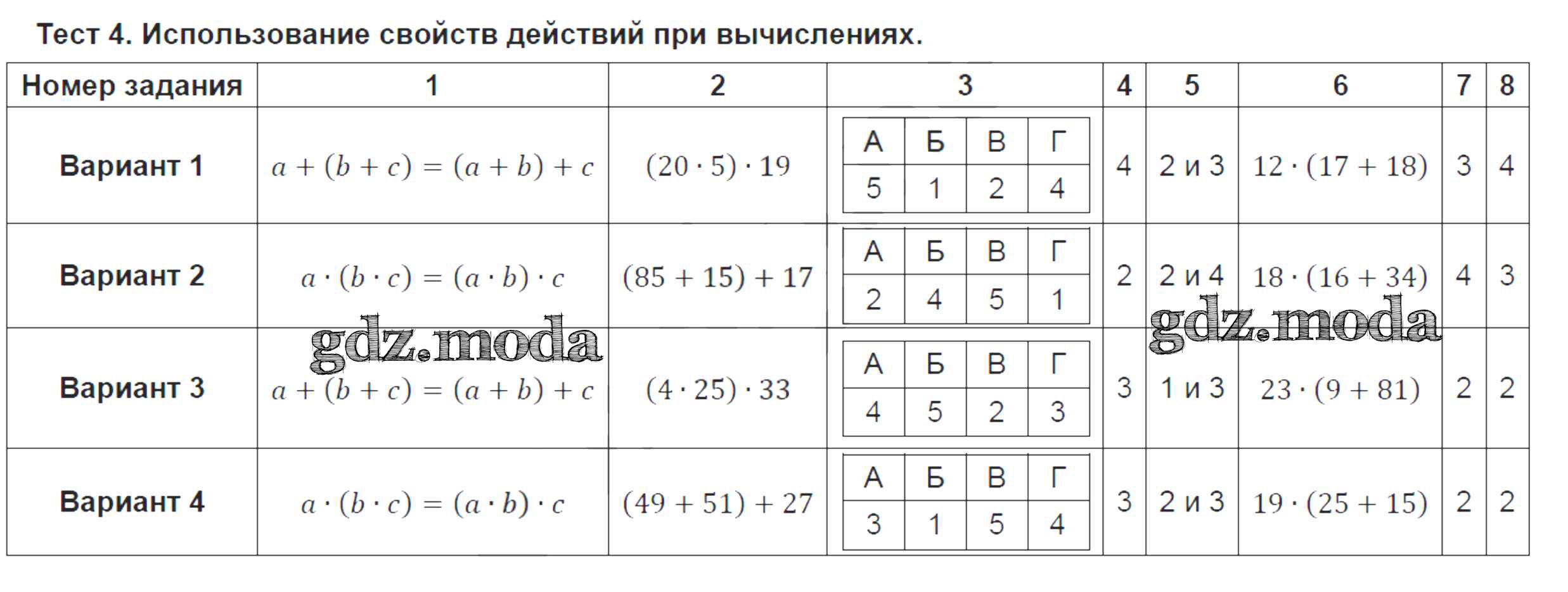 ГДЗ решение к заданию № Тест №4. Использование свойств действий при вычислениях Математика 5 класс Тематические тесты Кузнецова Л.В. Просвещение 2018 ФГОС бесплатно на гдз.мода!