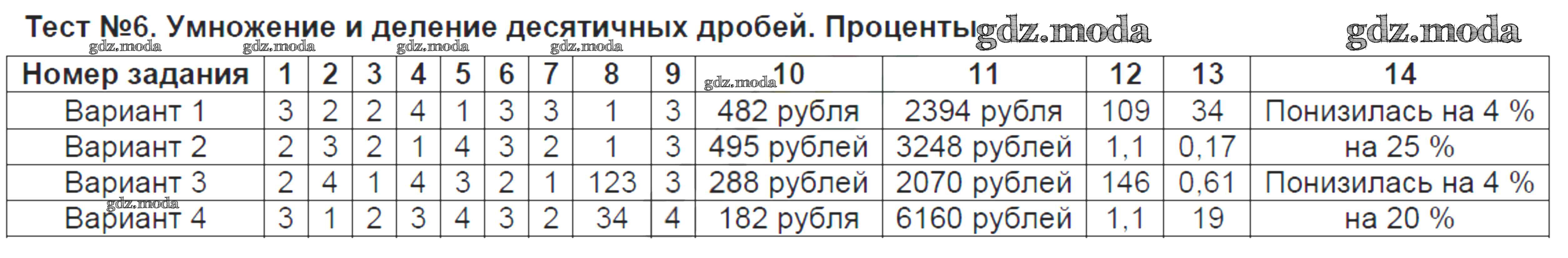 ГДЗ решение к заданию № Тест №6. Умножение и деление десятичных дробей. Проценты Математика 5 класс тесты Ерина Т.М. (к уч. Мерзляка) Экзамен 2017 ФГОС бесплатно на гдз.мода!