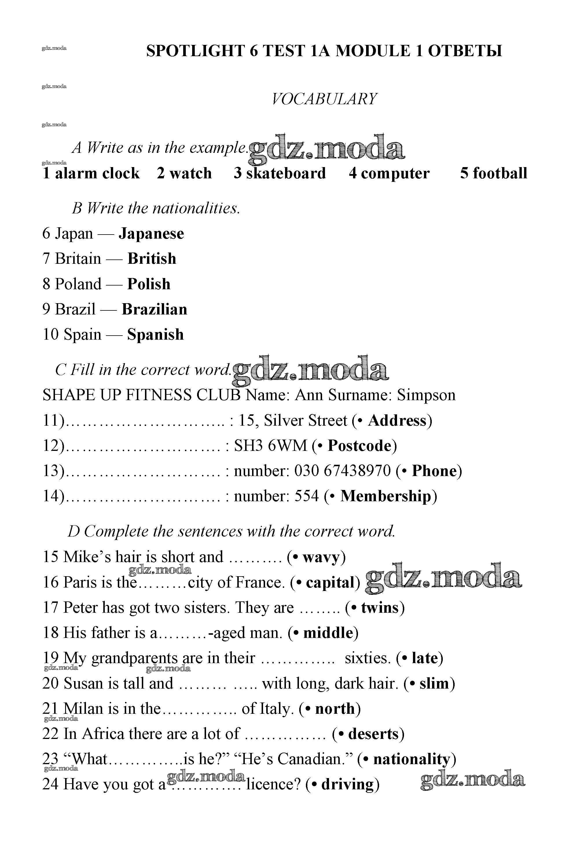 ГДЗ решение к заданию № 1A Английский язык 6 класс контрольные задания Ваулина Spotlight Просвещение 2017 ФГОС бесплатно на гдз.мода!