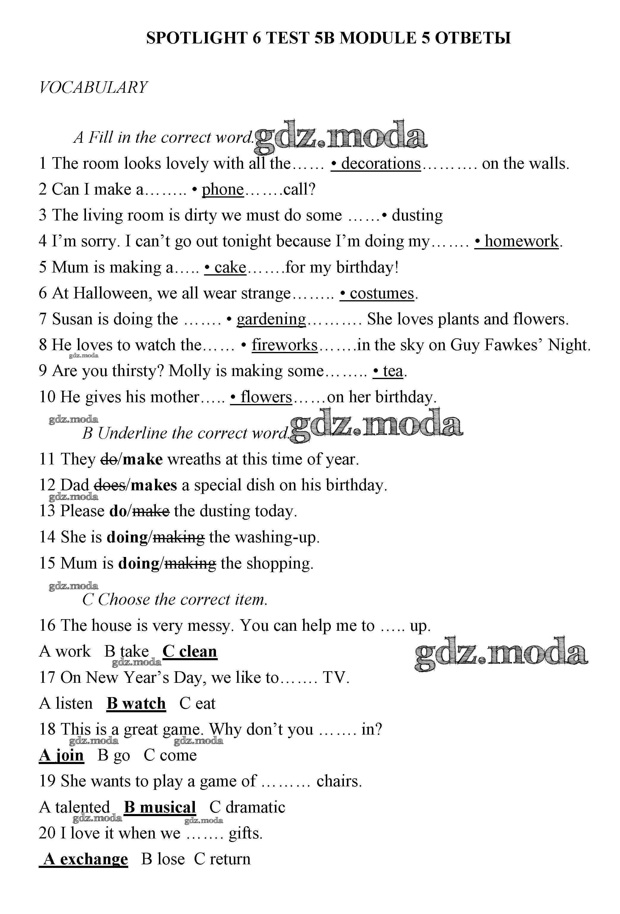 ГДЗ решение к заданию № 5В Английский язык 6 класс контрольные задания Ваулина Spotlight Просвещение 2017 ФГОС бесплатно на гдз.мода!