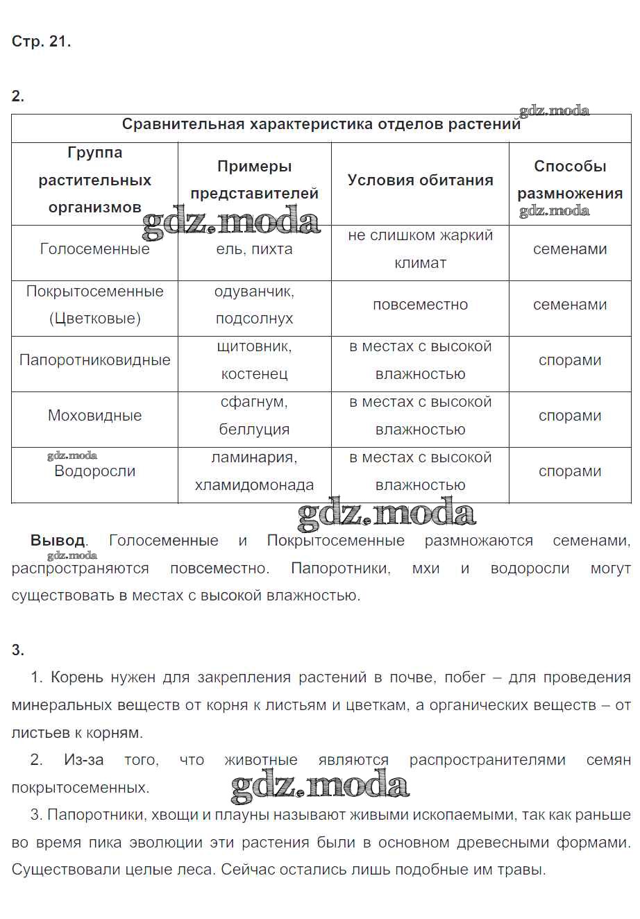 ГДЗ решение к заданию № 21 Биология 6 класс рабочая тетрадь Пономарева И.Н. Вентана-граф 2020 Часть 1, Часть 2 ФГОС бесплатно на гдз.мода!