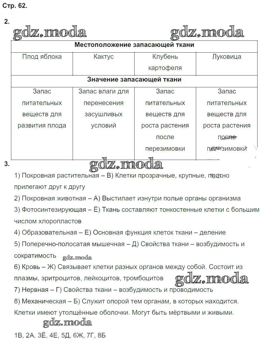 ГДЗ решение к заданию № 62 Биология 5-6 класс тетрадь-тренажер Сухорукова Л.Н. Просвещение 2016 Часть 1, Часть 2 ФГОС бесплатно на гдз.мода!