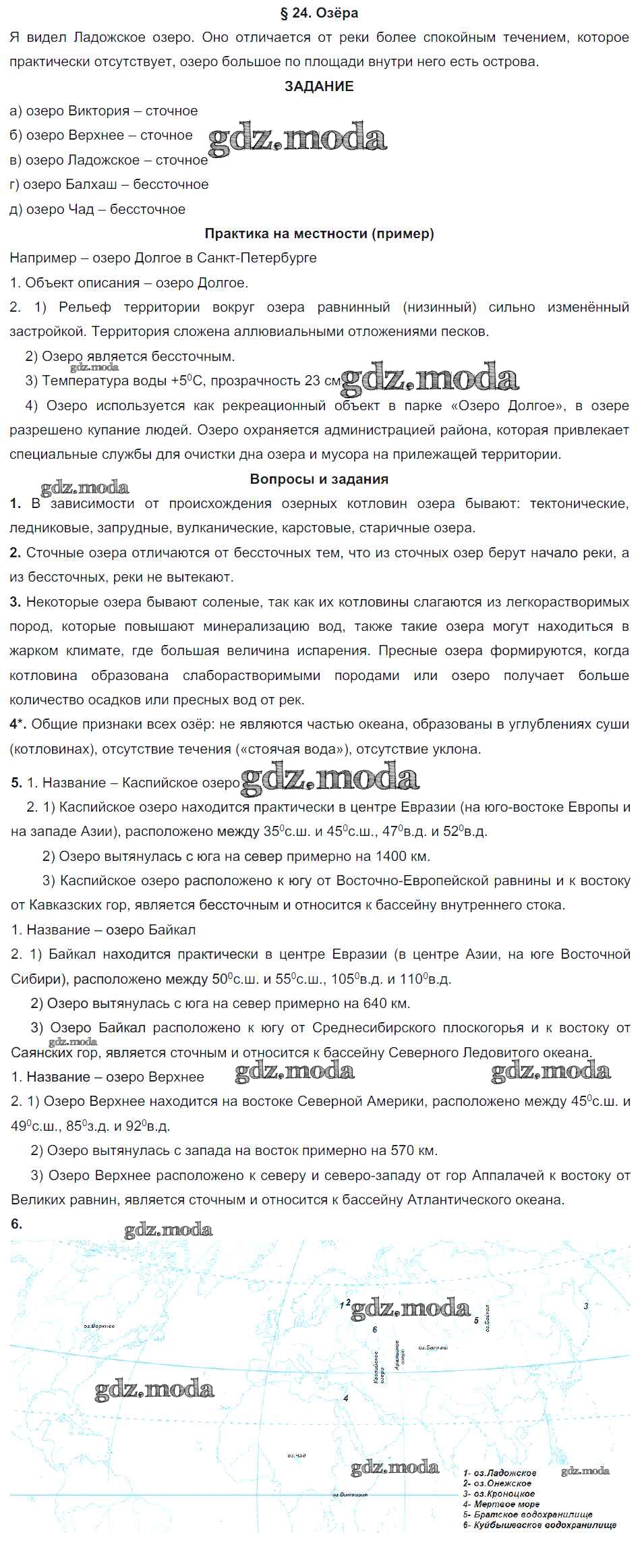 ГДЗ решение к заданию № §24. Озёра География. Начальный курс 6 класс Герасимова Т.В. Дрофа 2019 ФГОС бесплатно на гдз.мода!