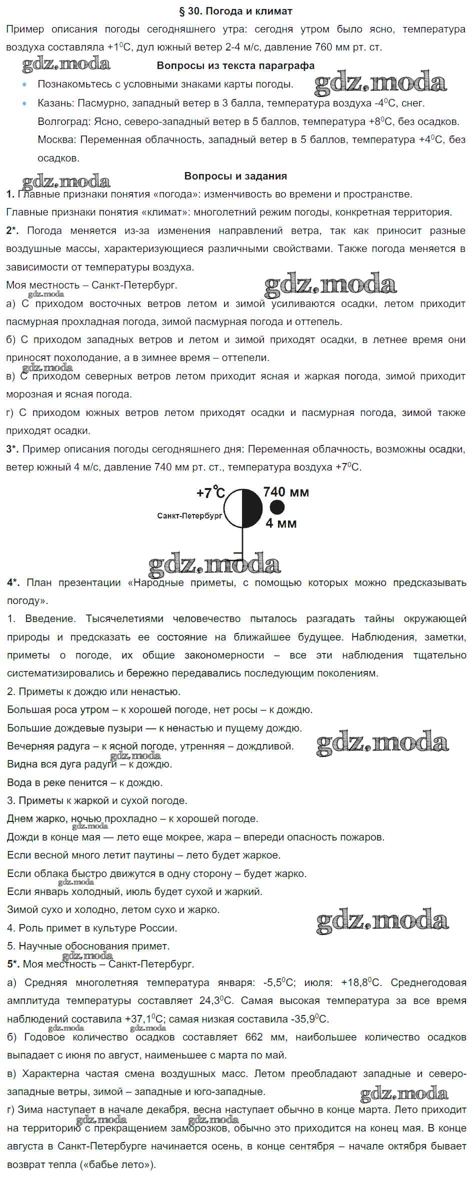 ГДЗ решение к заданию № §30. Погода и климат География. Начальный курс 6 класс Герасимова Т.В. Дрофа 2019 ФГОС бесплатно на гдз.мода!