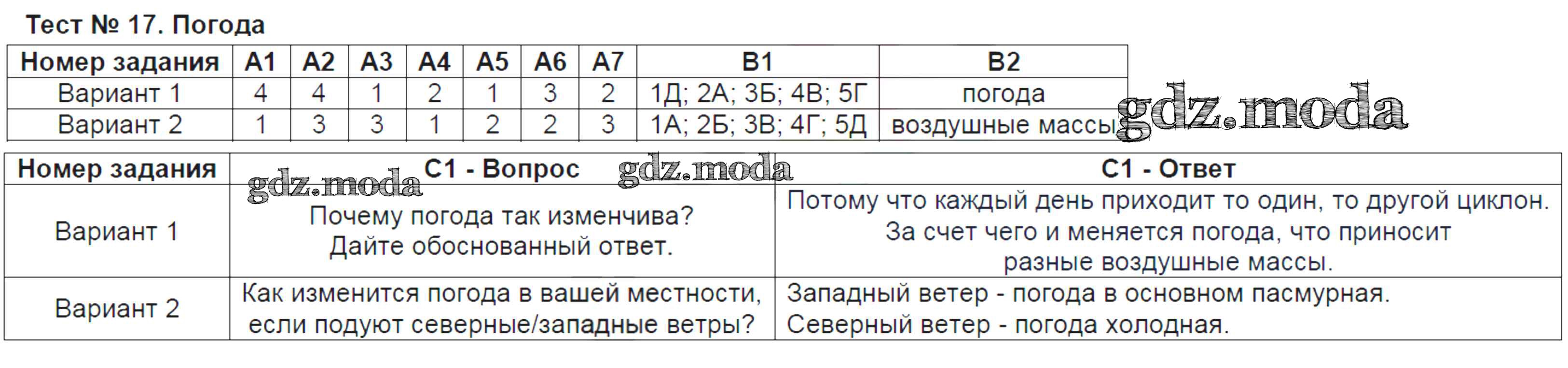 ГДЗ решение к заданию № Тест-17. Погода География 6 класс контрольно-измерительные материалы Жижина Е.А. ВАКО 2018 ФГОС бесплатно на гдз.мода!