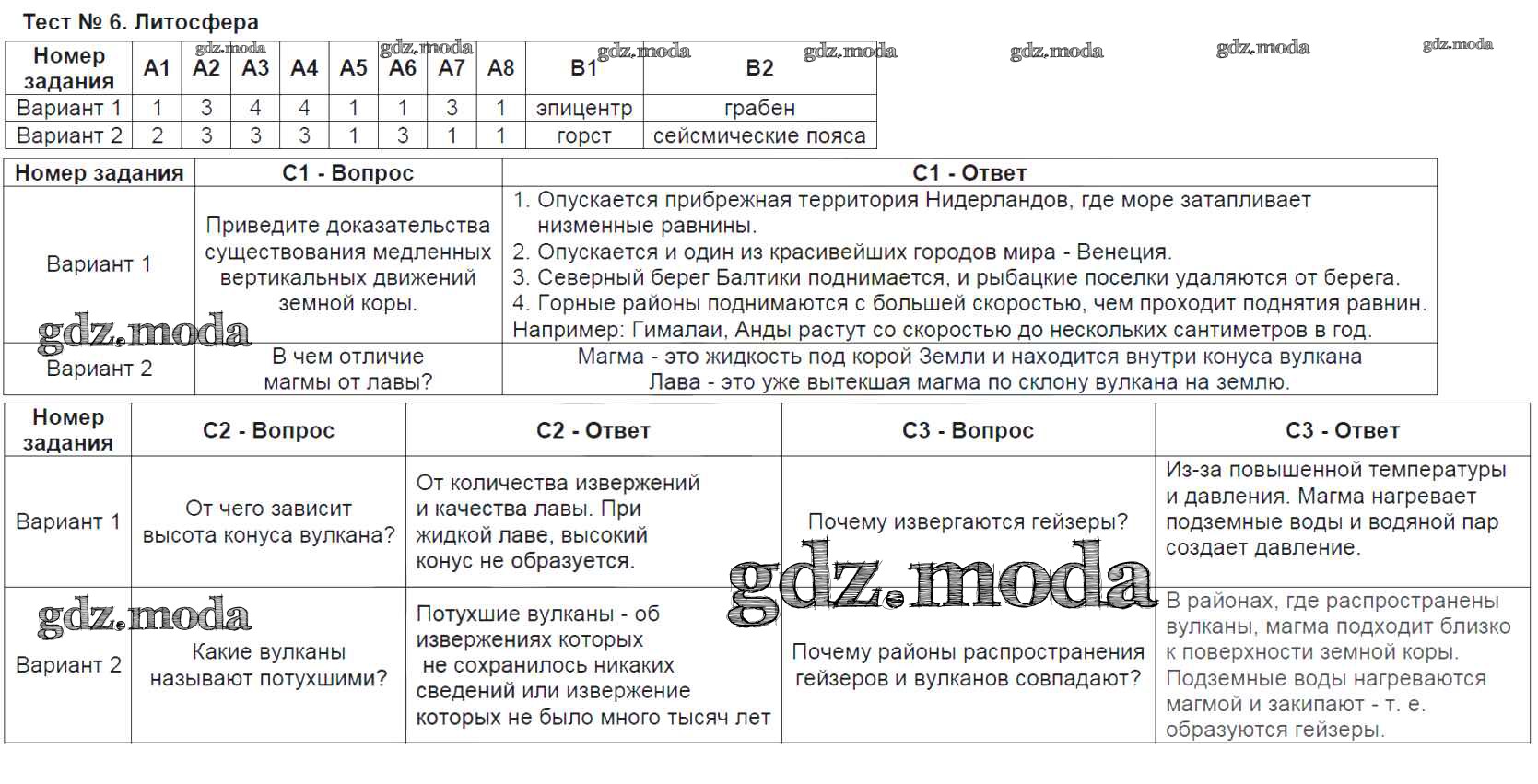 ОТВЕТ на задание № Тест-6. Литосфера Контрольно-измерительные материалы (КИМ) по Географии 6 класс Жижина