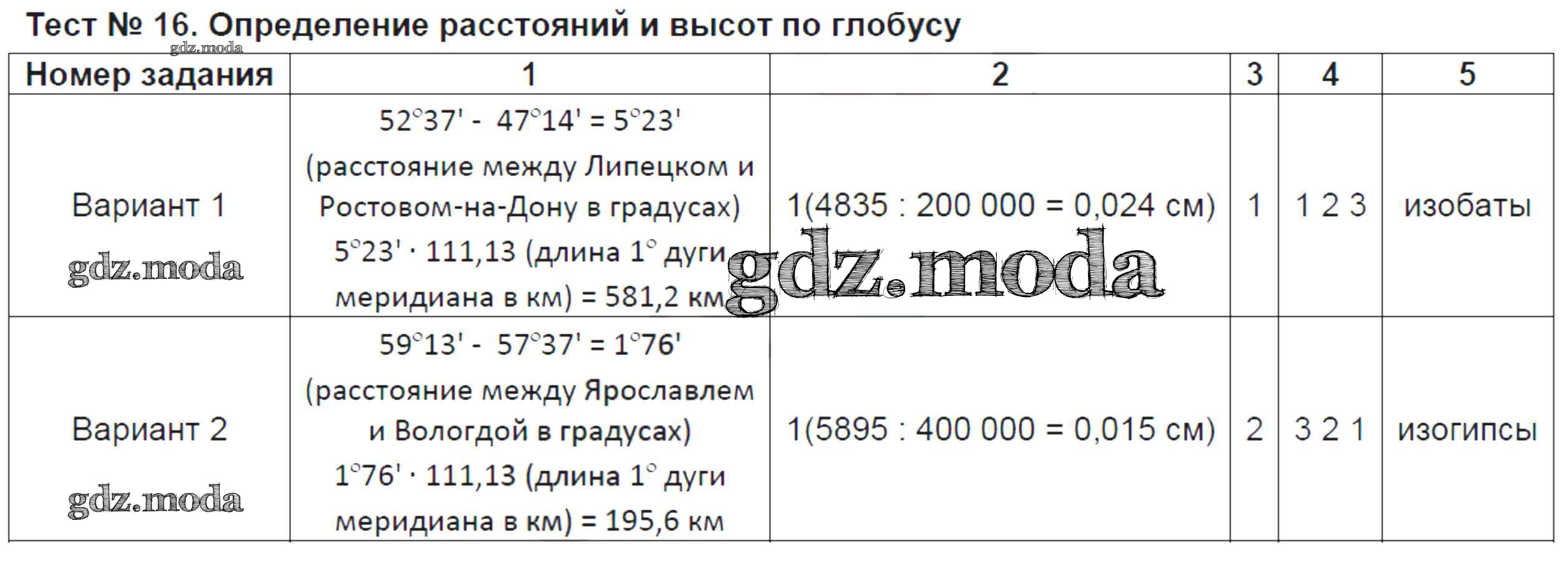 ГДЗ решение к заданию № Тест-16. Определение расстояний и высот по глобусу География 6 класс Тесты Пятунина О.А. (к уч. Летягина) Экзамен 2017 ФГОС бесплатно на гдз.мода!