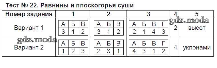 ОТВЕТ на задание № Тест-22. Равнины и плоскогорья суши Тесты по Географии 6 класс Пятунина УМК