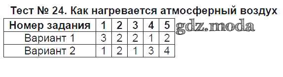ГДЗ решение к заданию № Тест-24. Как нагревается атмосферный воздух География 6 класс Тесты Пятунина О.А. (к уч. Летягина) Экзамен 2017 ФГОС бесплатно на гдз.мода!