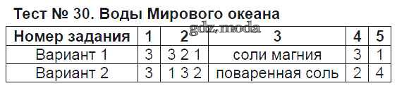ГДЗ решение к заданию № Тест-30. Воды Мирового океана География 6 класс Тесты Пятунина О.А. (к уч. Летягина) Экзамен 2017 ФГОС бесплатно на гдз.мода!