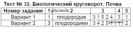 ГДЗ решение к заданию № Тест-32. Биологический круговорот. Почва География 6 класс Тесты Пятунина О.А. (к уч. Летягина) Экзамен 2017 ФГОС бесплатно на гдз.мода!