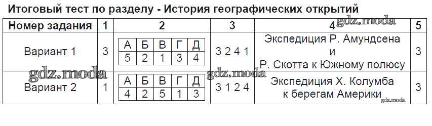 ОТВЕТ на задание № Итоговый тест по разделу - История географических открытий Тесты по Географии 6 класс Пятунина УМК