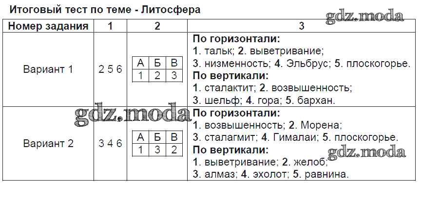 ГДЗ решение к заданию № Итоговый тест по теме - Литосфера География 6 класс Тесты Пятунина О.А. (к уч. Летягина) Экзамен 2017 ФГОС бесплатно на гдз.мода!
