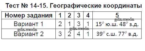 ГДЗ решение к заданию № Тест-14-15. Географические координаты География 6 класс Тесты Пятунина О.А. (к уч. Летягина) Экзамен 2017 ФГОС бесплатно на гдз.мода!