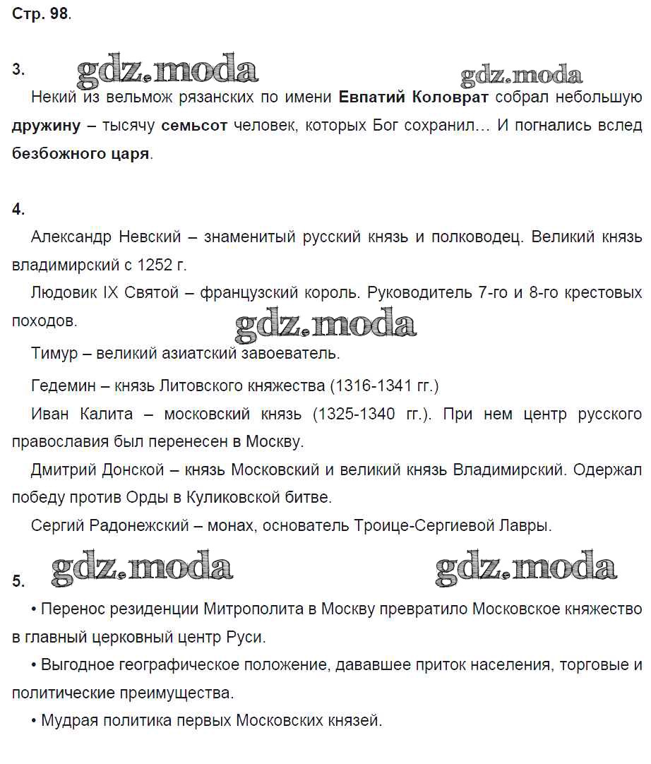 ГДЗ решение к заданию № стр. 98 История России 6 класс рабочая тетрадь Артасов И.А. Просвещение 2016 ФГОС бесплатно на гдз.мода!