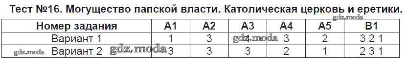 ГДЗ решение к заданию № Тест №16. Могущество папской власти. Католическая церковь и еретики История средних веков 6 класс контрольно-измерительные материалы (КИМ) Чернова М.Н. Экзамен 2015 ФГОС бесплатно на гдз.мода!