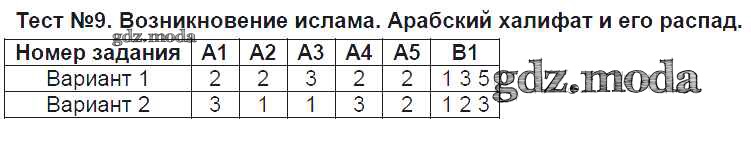 ГДЗ решение к заданию № Тест №9. Возникновение ислама. Арабский халифат и его распад История средних веков 6 класс контрольно-измерительные материалы (КИМ) Чернова М.Н. Экзамен 2015 ФГОС бесплатно на гдз.мода!