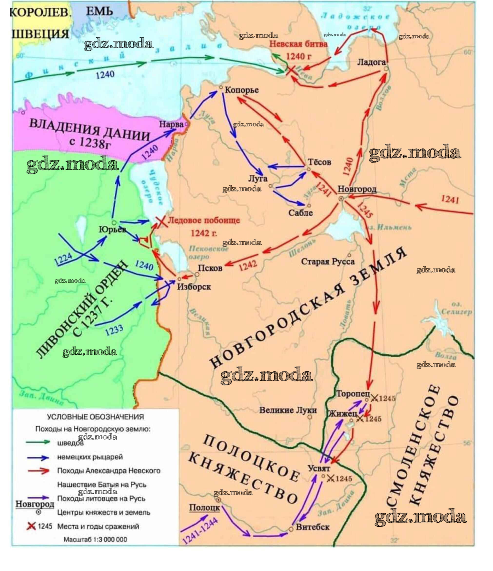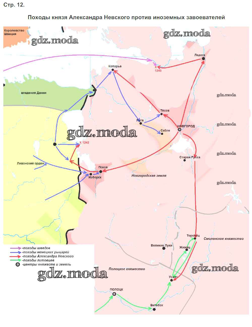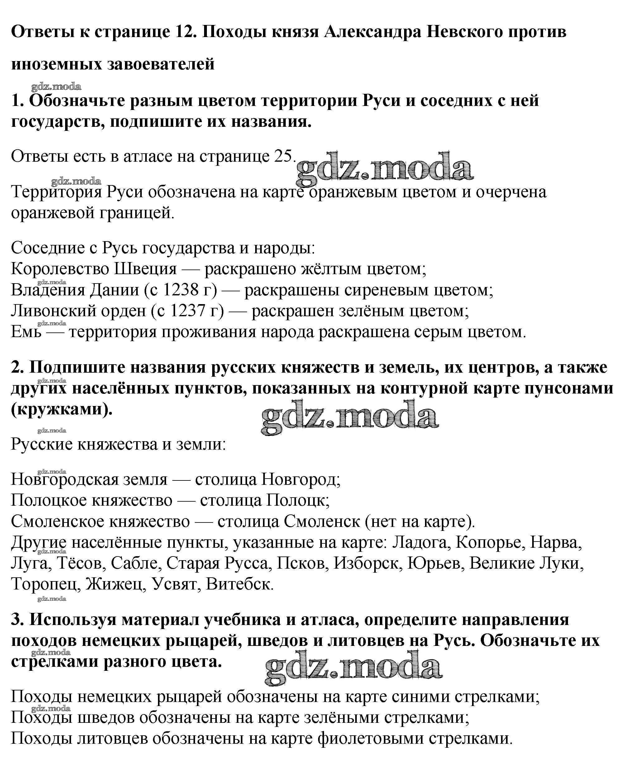 ОТВЕТ на задание № Страница 12. Походы князя Александра Невского против иноземных завоевателей Контурные карты по Истории 6 класс Тороп УМК