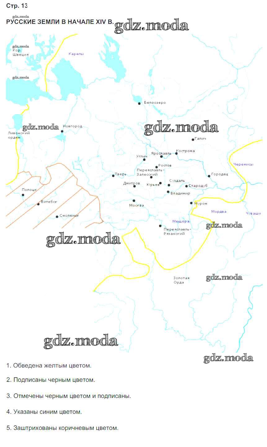 ГДЗ решение к заданию № 13 История России с древнейших времен до начала XVI века 6 класс Контурные карты Пчелов Е.В. Русское слово 2017 ФГОС бесплатно на гдз.мода!