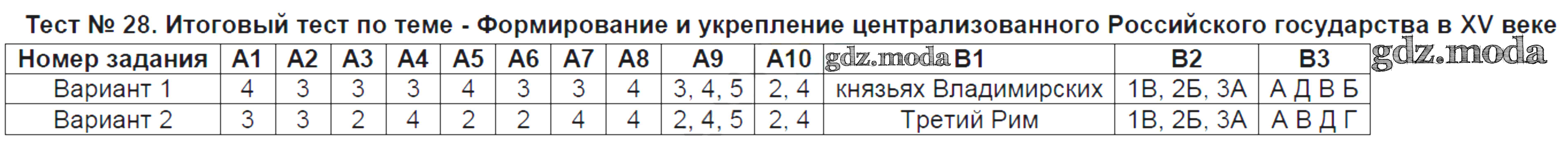 ГДЗ решение к заданию № Тест №28. Итоговый тест по теме - Формирование и укрепление централизованного Российского государства в XV веке История России 6 класс контрольно-измерительные материалы Волкова К.В. ВАКО 2017 ФГОС бесплатно на гдз.мода!
