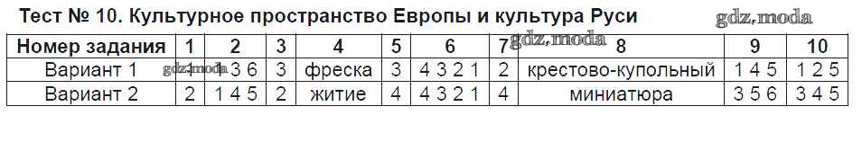 ГДЗ решение к заданию № Тест №10. Культурное пространство Европы и культура Руси История России 6 класс Тесты Воробьева С.Е. (к уч. Торкунова) Экзамен 2017 Часть 1, Часть 2 ФГОС бесплатно на гдз.мода!