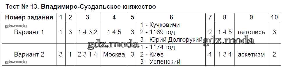 ОТВЕТ на задание № Тест №13.Владимиро-Суздальское княжество Тесты по Истории 6 класс Воробьёва УМК