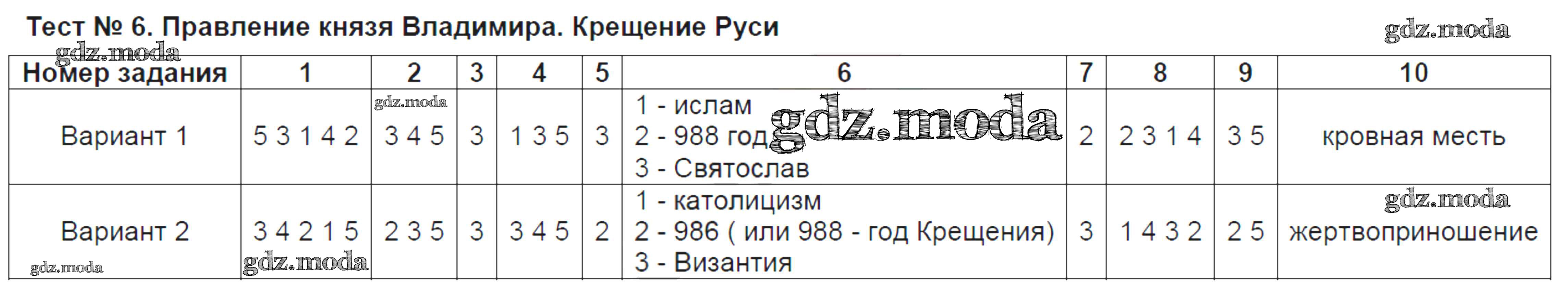 ГДЗ решение к заданию № Тест №6. Правление князя Владимира. Крещение Руси История России 6 класс Тесты Воробьева С.Е. (к уч. Торкунова) Экзамен 2017 Часть 1, Часть 2 ФГОС бесплатно на гдз.мода!