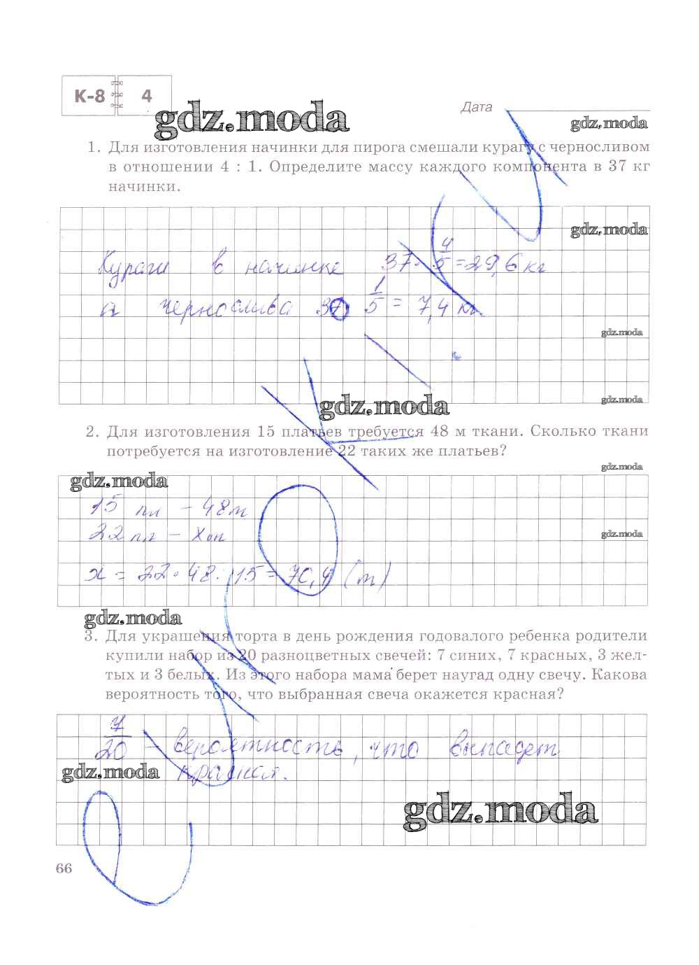 ГДЗ решение к заданию № 66 Математика 6 класс тетрадь для контрольных работ Зубарева И.И. Мнемозина 2020 Часть 1, Часть 2 ФГОС бесплатно на гдз.мода!