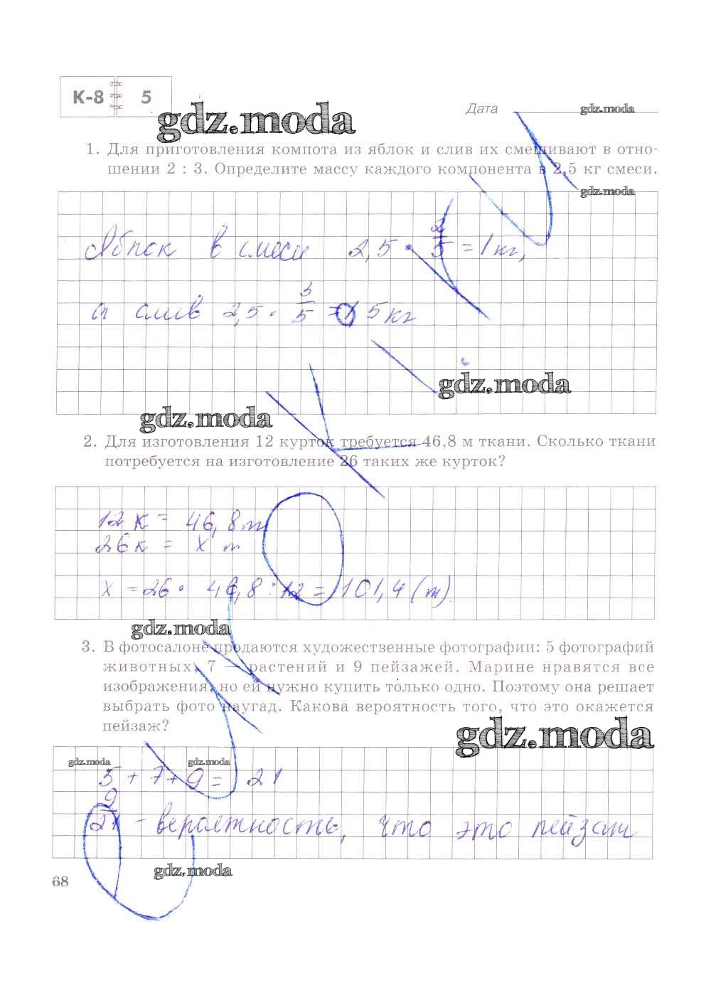 ГДЗ решение к заданию № 68 Математика 6 класс тетрадь для контрольных работ Зубарева И.И. Мнемозина 2020 Часть 1, Часть 2 ФГОС бесплатно на гдз.мода!