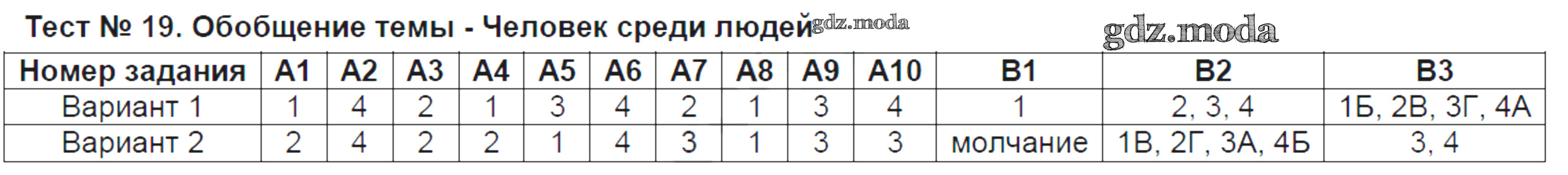 ГДЗ решение к заданию № Тест №19. Обобщение темы - Человек среди людей Обществознание 6 класс контрольно-измерительные материалы (КИМ) Поздеева А.В. ВАКО 2017 ФГОС бесплатно на гдз.мода!