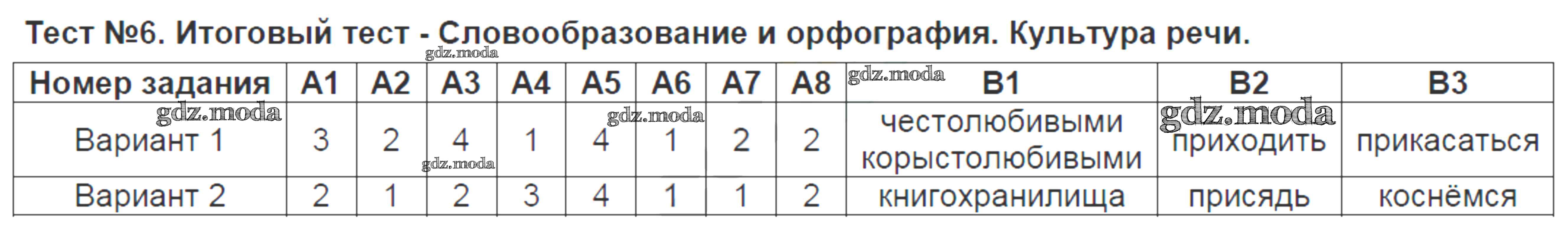 ГДЗ решение к заданию № Тест-6. Итоговый тест - Словообразование и орфография. Культура речи Русский язык 6 класс контрольно-измерительные материалы (КИМ) Аксенова Л.А. Экзамен 2014 ФГОС бесплатно на гдз.мода!