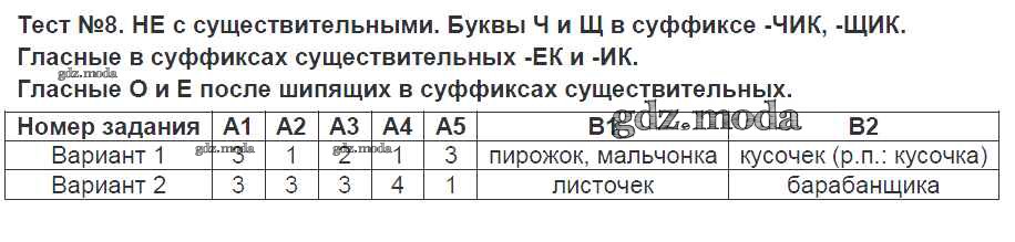 ОТВЕТ на задание № Тест-8. НЕ с существительными. Буквы Ч и Щ в суффиксе -ЧИК, -ЩИК Контрольно-измерительные материалы (КИМ) по Русскому языку 6 класс Аксенова