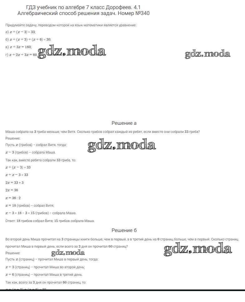 ОТВЕТ на задание № 340 Учебник по Алгебре 7 класс Дорофеев Академический школьный учебник