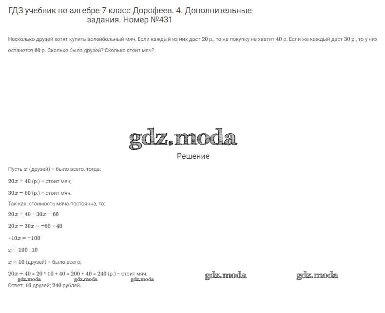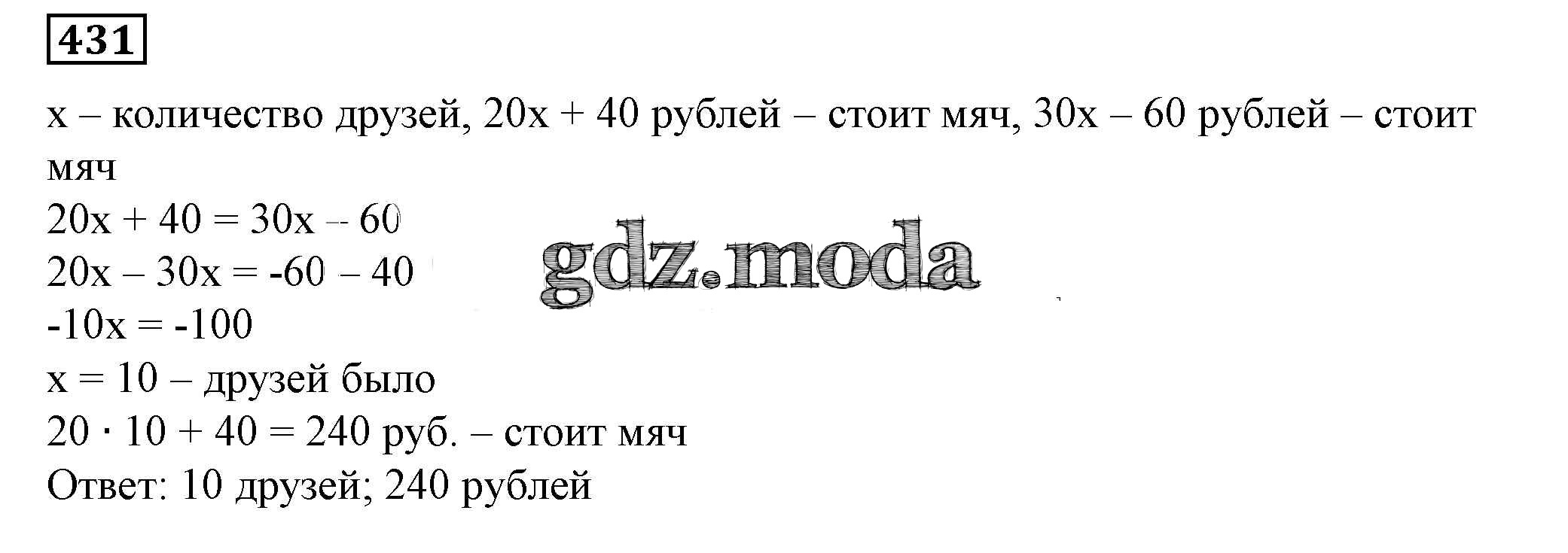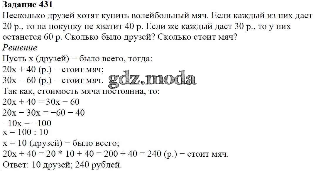 ОТВЕТ на задание № 431 Учебник по Алгебре 7 класс Дорофеев Академический школьный учебник