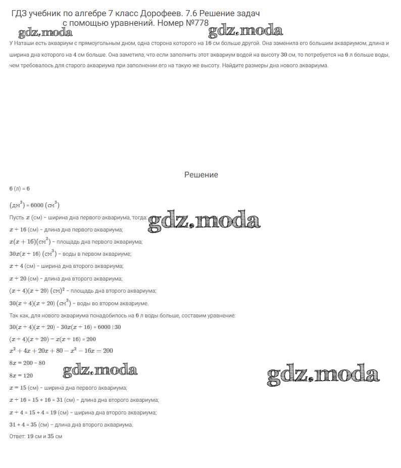 ОТВЕТ на задание № 778 Учебник по Алгебре 7 класс Дорофеев Академический школьный учебник