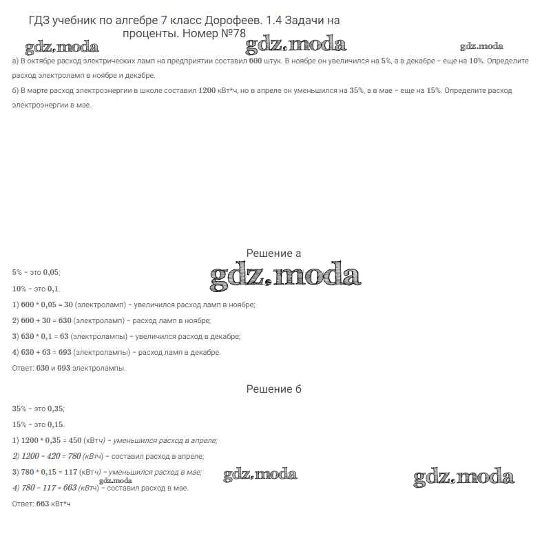 ОТВЕТ на задание № 78 Учебник по Алгебре 7 класс Дорофеев Академический школьный учебник