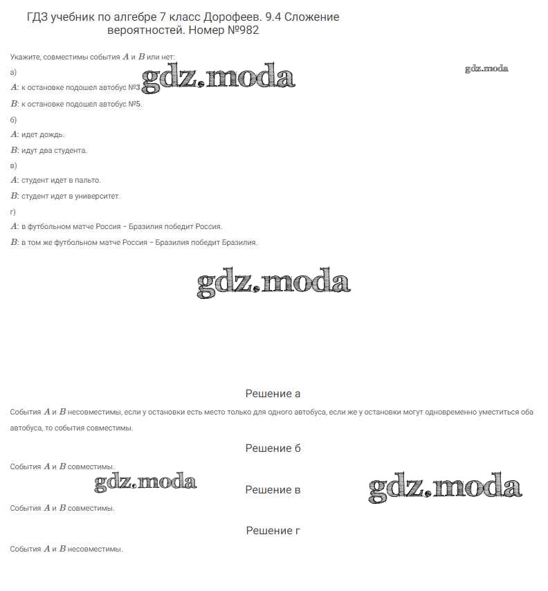 ОТВЕТ на задание № 982 Учебник по Алгебре 7 класс Дорофеев Академический школьный учебник