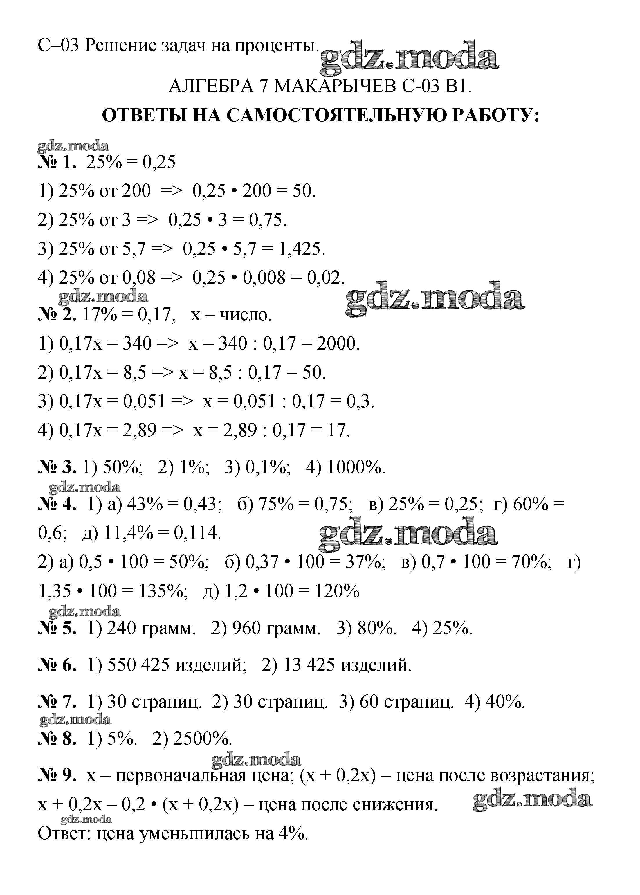ОТВЕТ на задание № С-3. Решение задач на проценты Дидактические материалы по Алгебре 7 класс Звавич