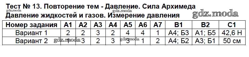 ГДЗ решение к заданию № Тест №13. Повторение тем - Давление. Сила Архимеда и др. Физика 7 класс контрольно-измерительные материалы Бобошина С.Б. Экзамен 2014 ФГОС бесплатно на гдз.мода!