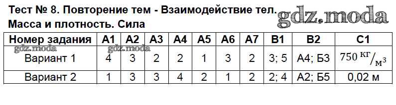 ОТВЕТ на задание № Тест №8. Повторение тем - Взаимодействие тел. Масса и плотность. Сила Контрольно-измерительные материалы (КИМ) по Физике 7 класс Бобошина