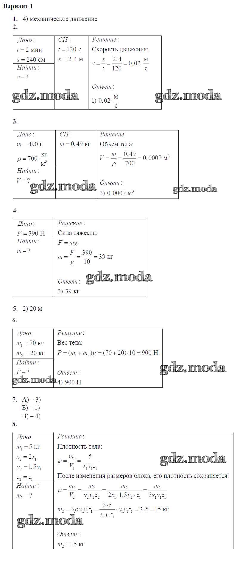 ГДЗ решение к заданию № Вар. 1 Физика 7 класс Контрольные и самостоятельные работы Громцева О.И. (к уч. Перышкина) Экзамен 2020 ФГОС бесплатно на гдз.мода!