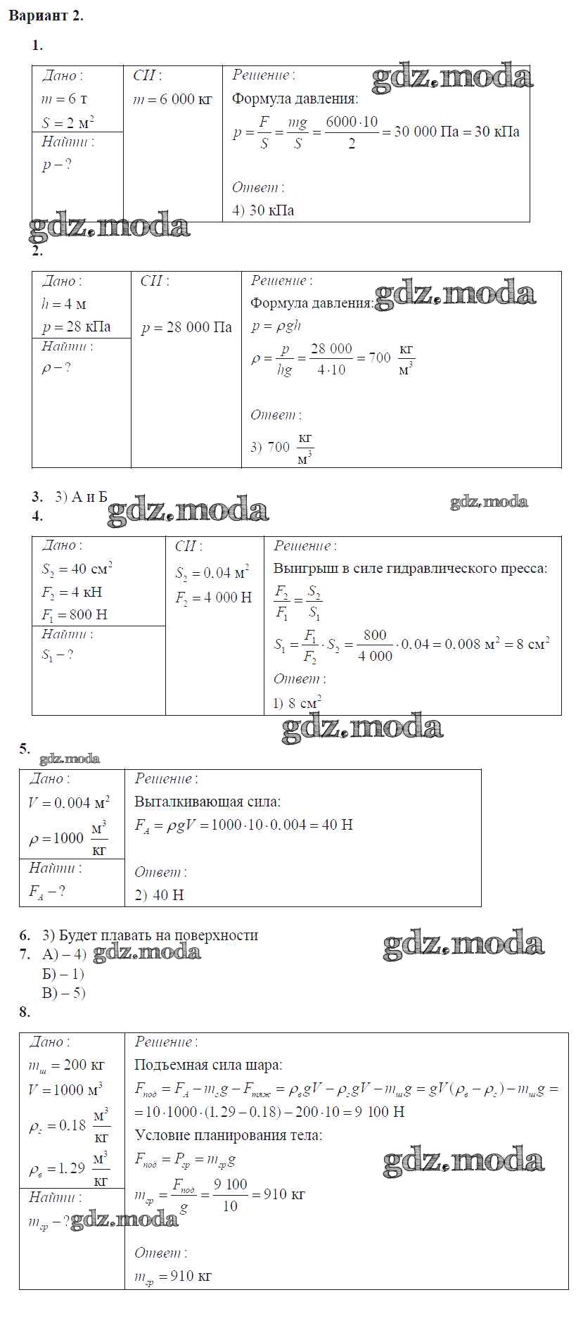 контрольная работа / глава 3. давление твердых тел, жидкостей и газов / вар. 2