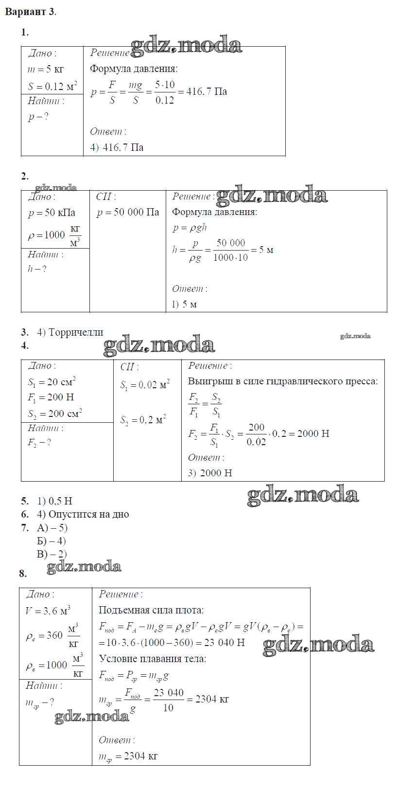 контрольная работа / глава 3. давление твердых тел, жидкостей и газов / вар. 3