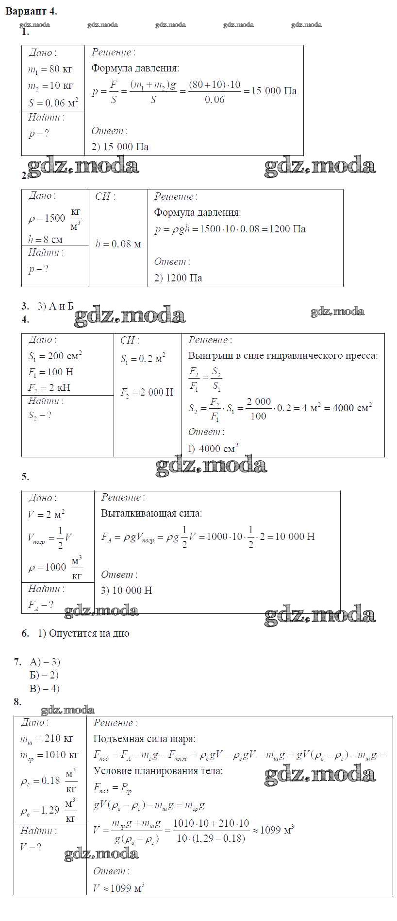 контрольная работа / глава 3. давление твердых тел, жидкостей и газов / вар. 4