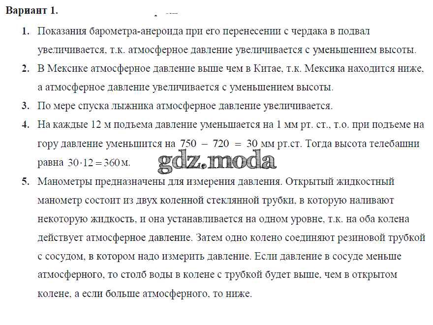 самостоятельная работа / ср №33. атмосферное давление на различных высотах. манометры / вар. 1